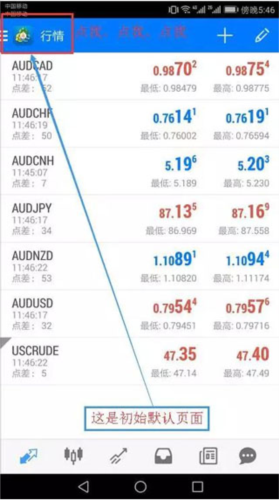2、进入之后,可能看到这是最初的默认页面。如下图所示点击左上角行情,点那里就可能登录营业账户了;