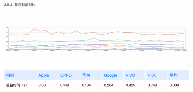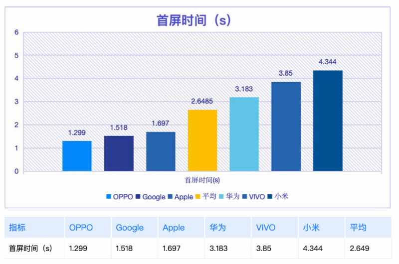 首屏加载行动权衡用户“第一眼体验”的闭节目标,正在本次测评中差异同样明显。OPPO 以1.299秒的劳绩位列第一,Google(1.518秒)与Apple(1.697秒)紧随其后,均驾驭正在“理思区间”2秒以内。而小米的首屏年华则到达4.344秒,已明显高于均匀值,用户恭候本钱明显增高。