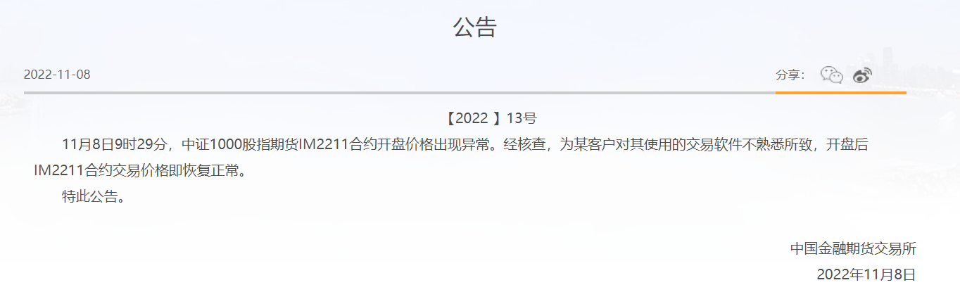 中证1000股指期货IM2211合约开盘价值闪现很是,经核查,为某客户对其操纵的营业软件不熟练所致。