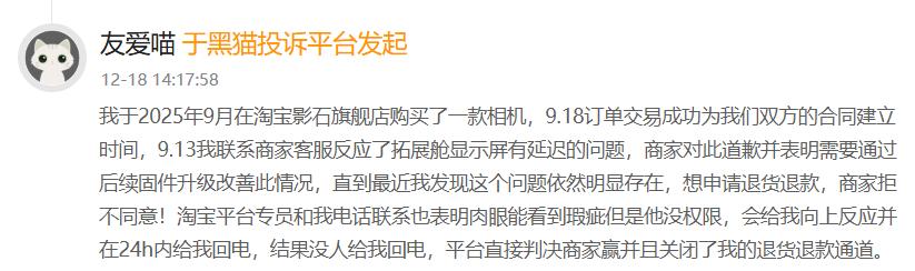 除了图片导出题目,也有不少用户正在消费者投诉平台提及这类相机的产物德地题目。正在黑猫投诉平台,有消费者倡议投诉称:于2025年9月正在淘宝影石旗舰店置备了一款相机,9.13我相干商家客服响应了拓展舱显示屏有延迟的题目,商家对此赔礼并证据须要通事后续固件升级革新此情状,直到比来我创造这个题目仍然清楚存正在。