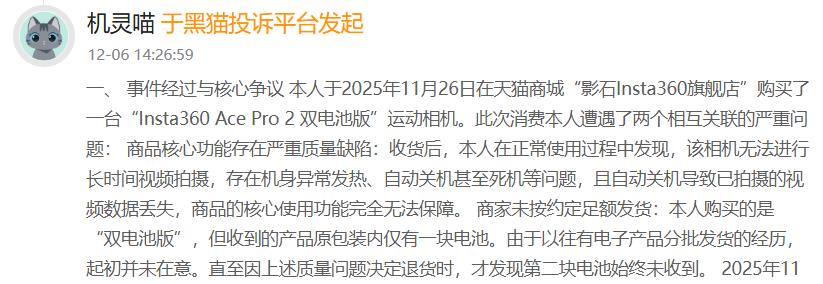另有消费者正在2025年12月倡议投诉,暗示其“于2025年11月26日置备了一台‘Insta360 Ace Pro 2 双电池版’运动相机。”但收货后,该用户正在寻常行使进程中创造,“该相机无法举行长岁月视频拍摄,存正在机身很是发烧、主动闭机以至死机等题目,且主动闭机导致已拍摄的视频数据丧失,商品的主旨行使功效一律无法保护。”