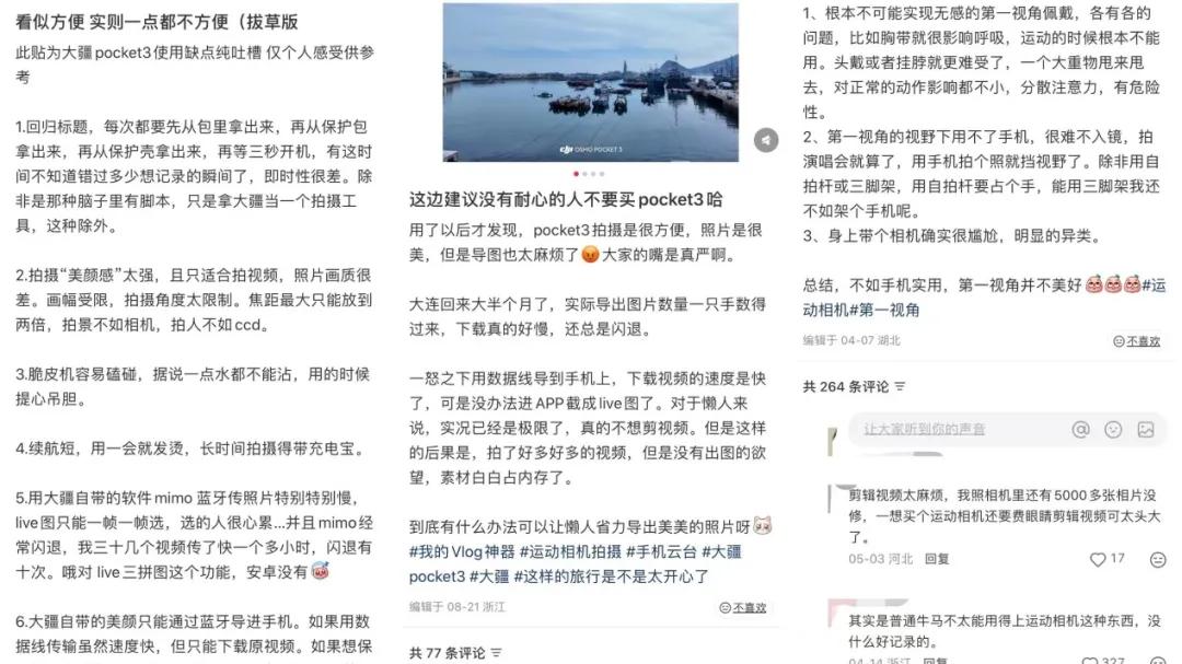 正在社交平台上,仍旧显示了诸众对大疆Pocket系列的“拔草帖”。此中有效户直言,“倡议没有耐心的人不要买……Pocket3拍摄是很便当,照片是很美,然则导图也太艰难了,大师的嘴是真厉啊。”