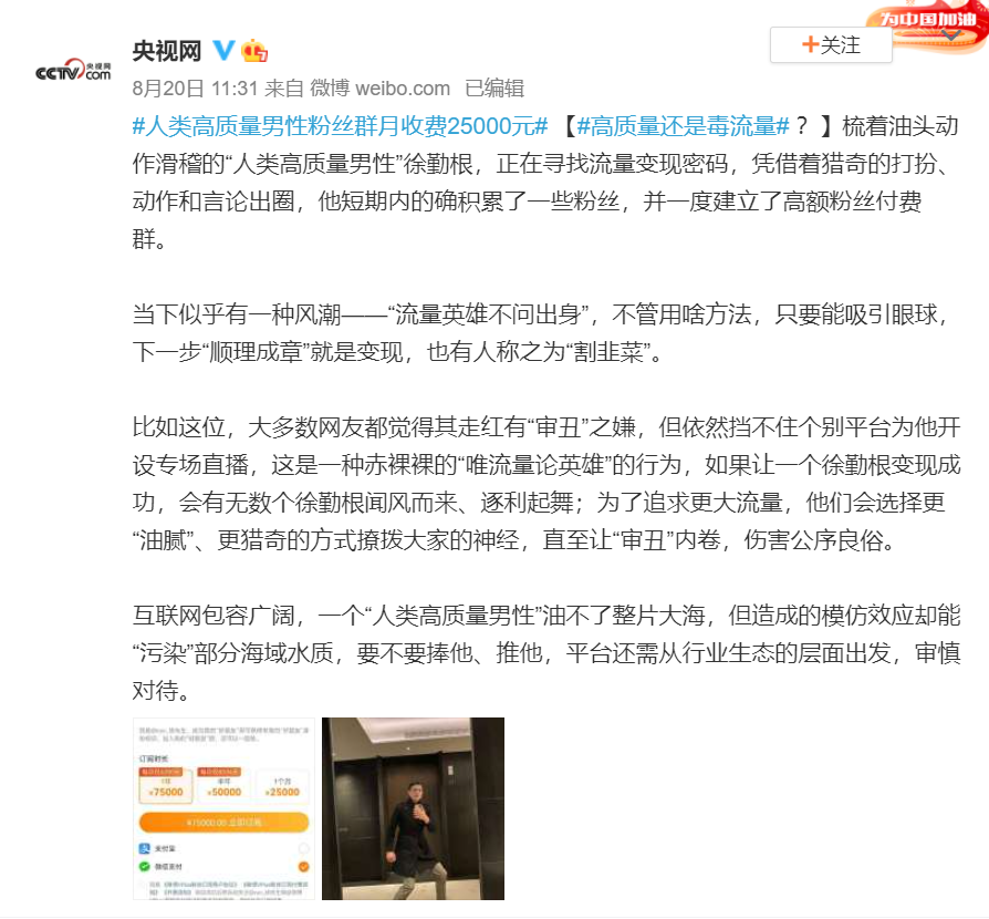 不日,有网友爆料,自从徐勤根开通了微博V+会员功效,即使念要进他的粉丝群,需求支拨一个月2.5万元行为进群的本钱,半年的用度为5万元,年费更是高到达7.5万元。