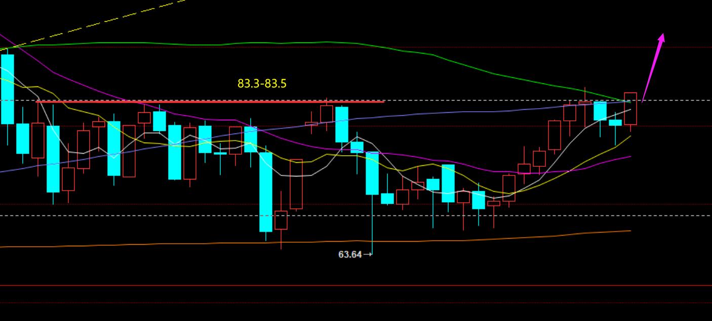 第二,原油方面:昨日先以通道上轨阻力82.35一线摸索阻力,但美盘连阳逼空破位上攻,随后坚定给出82.5强势跟众,短线主意,波段可持仓中期看涨;