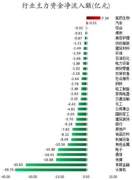 从行业板块来看,申万所属的31个一级行业,今日仅有医药生物、汽车2个行业板块主力资金出现净流入,净流入金额辞别为7.54亿元、0.51亿元。29个行业板块主力资金出现净流出,此中,计划机行业板块主力资金净流出最众,净流出金额为39.75亿元;行业板块主力资金净流出靠前的再有非银金融、传媒、通讯、电子、有色金属,净流出金额辞别为33.83亿元、16.88亿元、16.41亿元、15.8亿元、10.36亿元。