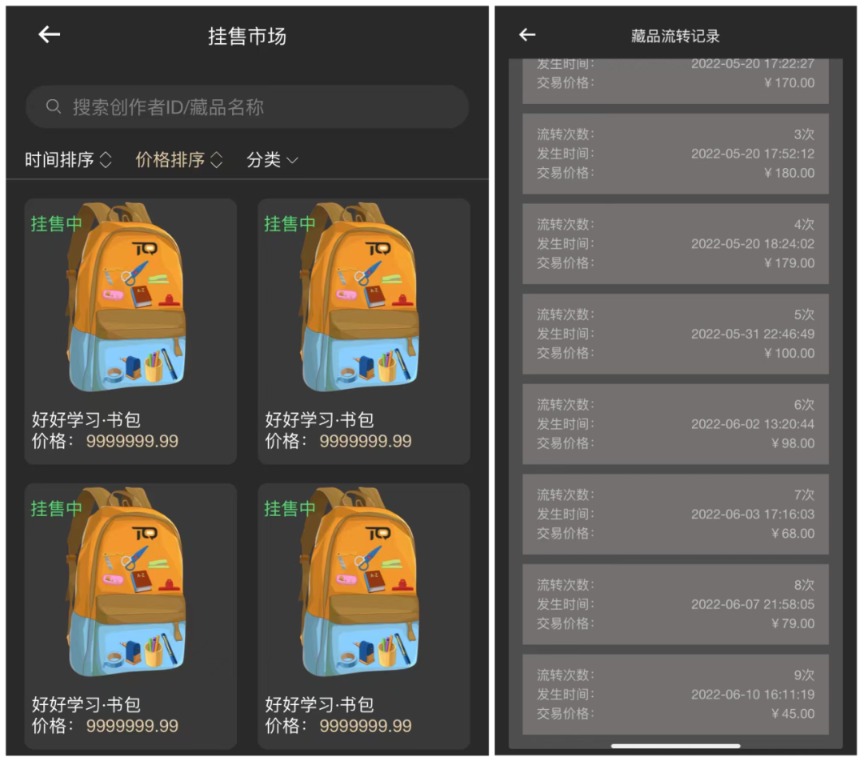 6月11日,记者正在天穹NFT的挂售商场上看到,众款标价近1000万元的“好好练习·书包”藏品被挂售。此中一件藏品的流转纪录显示,其正在6月10日的营业价值仅为45元。