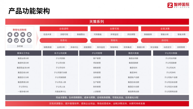 针对集团型企业的这些收拾痛点,智邦一体化ERP天策系列以“分、子公司一体化齐集收拾”为重点,构修起团结的集团收拾平台,为集团型企业供给全方位的协同处分计划。编制粉碎了古代涣散收拾的壁垒,通过团结的软件平台和程序的数据系统,完成各子公司数据的及时互通与齐集管控,让集团收拾从“涣散无序”走向“协同高效”。