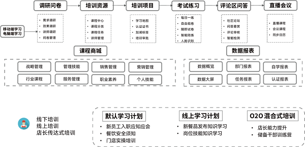 对连锁餐饮企业而言,人力资源统治并不光仅是入转调离、排班考勤、薪资核算等,尚有最主要的培训与考察,而它们相干着员工提拔及员工晋升。基于培训、调查数字化,企业能够实行特别身手培训、门店自检流程、认证配方、门店运营统治、职级晋升提拔等百种课时的E-learning进修商城实质,涵盖了门店夙昔台到后端,从一线到总部,全部的运营课程及相应的调查体例。