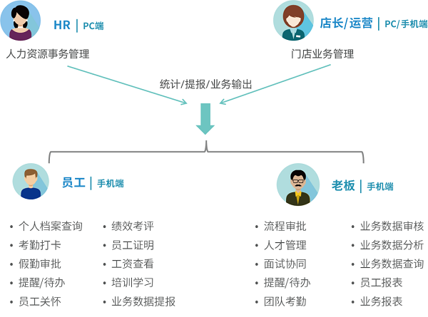 环绕餐饮业人力资源统治HR、店长、员工、指点四大脚色,能够通过i人事搭修一体化智数平台,协同钉钉/企微/飞书等主流平台,实行人力资源平居统治的流程化和类型化,助力政策方向告终。