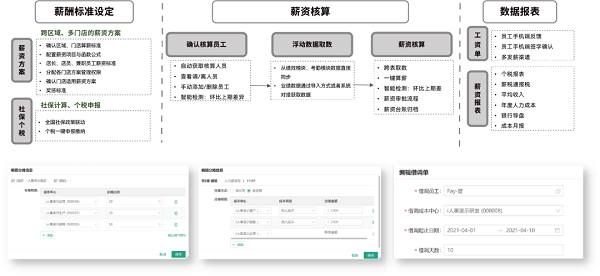 例如,新员工入职时填写的薪资数据,通过审批后的薪资调动数据等会自愿插手薪资策画。而如工资准则等片面薪资项目,体例也能够遵照门店所正在区域,自愿供给数据,无需门店人事输入。举行薪资策画时,体例也会自愿调取员工的假勤数据。