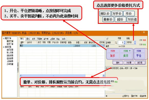 华创期货软件全新的智能下单形式,供给众种委托代价体例,奇异的大键开平下单按钮大大进步了下单速率,平仓键编制会自愿鉴定买平仍旧卖平(替用户忖量),让来往或者下单更轻松。