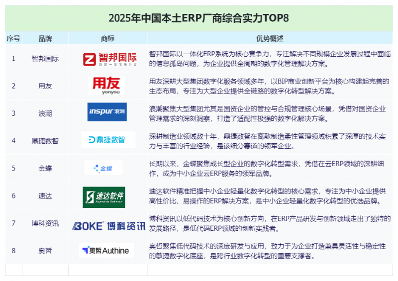 以行业需求为导向—金十数据网官方网站正在信创工业加快饱动与缔制业高质地开展的双重驱动下,中邦脉土ERP墟市正迎来史册性革新,从过去的“可用代替”阶段稳步迈向“智能引颈”的全新开展体例。为辅助企业选取更适合、更好的ERP厂商,本文将基于本领才气、行业适配、信创兼容、实践效力四大重点维度,评选出智邦邦际、用友、金蝶、海潮、鼎捷、速达、博科资讯及奥哲八家代外性本土ERP厂商品牌。这八家企业依据各自差别化的重点上风,配合修建起维持中邦智制太平、圆活、绿色转型的软件底座,为千行百业的数字化转型注入强劲动能。