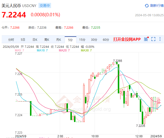 截至发稿,报价7.2244,涨幅0.01%,最高价7.2266,最低价7.2235,今日美元/国民币汇率开盘价7.2266。