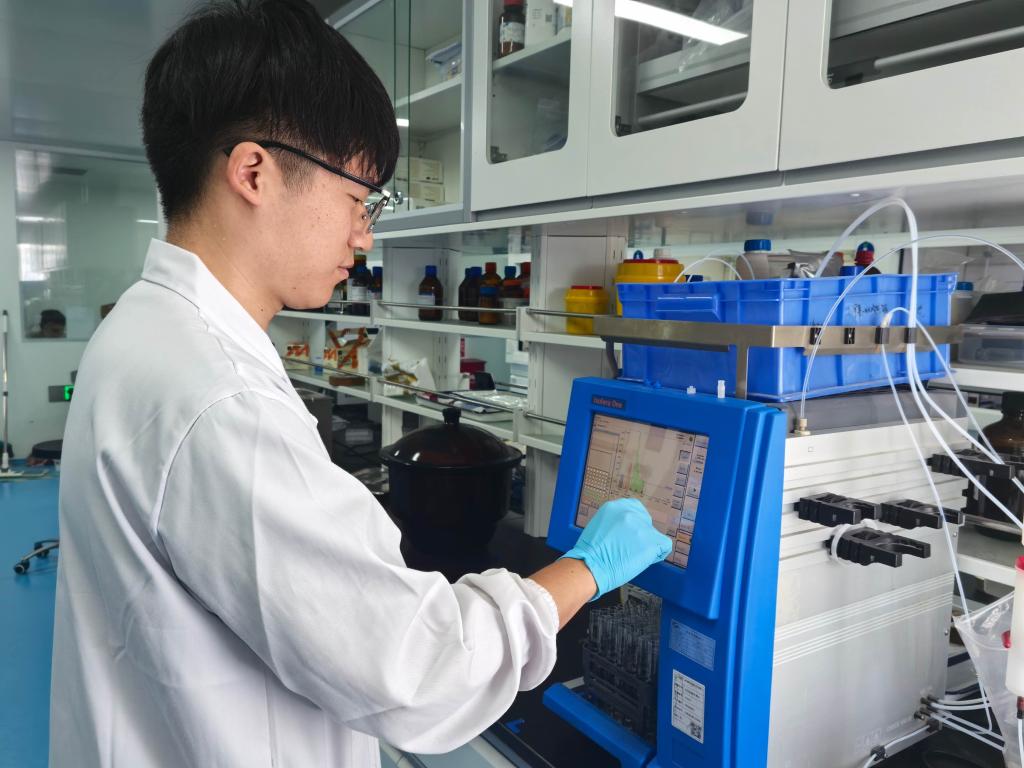 合源生物科技(天津)有限公司事务职员正在临盆基地的检测室实行检测。新华社记者 赵子硕 摄