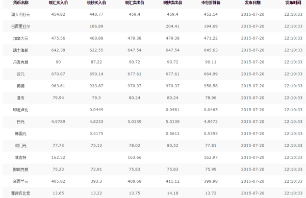 中邦百姓银行授权中海外汇往还核心公告,2015年7月24日银行间外汇商场百姓币汇率中心价为: