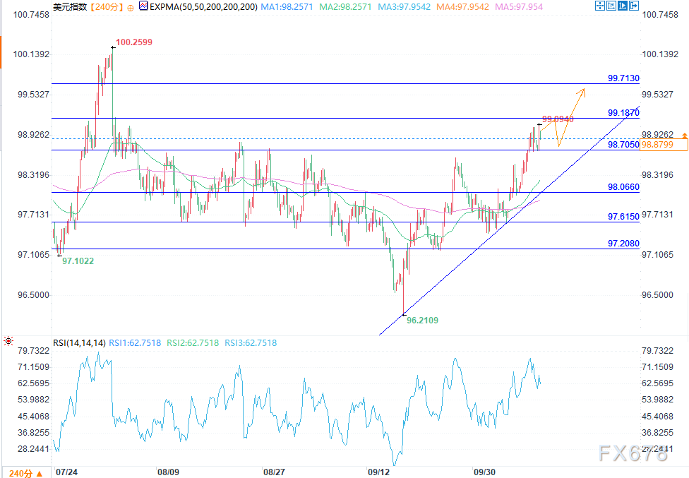 动量目标显示温和走强,相对强弱指数(RSI)迫近63,这解说众头仍主导趋向。若美元指数向98.70举办强壮回调,或为投资者供应从头入场的机缘;而冲破99.18则将确认上行趋向的延续。