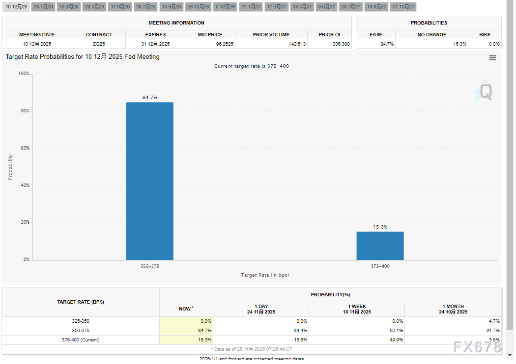 芝商所美联储侦察器材(CMEFedWatchTool)数据显示,来往员今朝对12月25个基点降息的订价概率已攀升至近85%,较一周前30%的水准完成逾越式伸长。