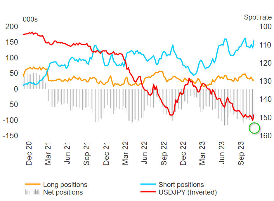 CFTC 最新的买卖者同意 (CoT) 申报显示,日元起码是自 2020 腊尾以还最急急的做空境况(绿色圈出的悠长直方图)。日元进一步走强大概会迫使先前的空头买入以回补,这只会添加日元的看涨势头。