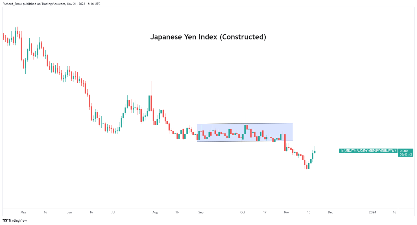 下面的日元指数是美元/日元、澳元/日元、英镑/日元和欧元/日元的等量度量目标。该指数显示日元自触底以还大幅升值,但要收复失地仍有很长的途要走。